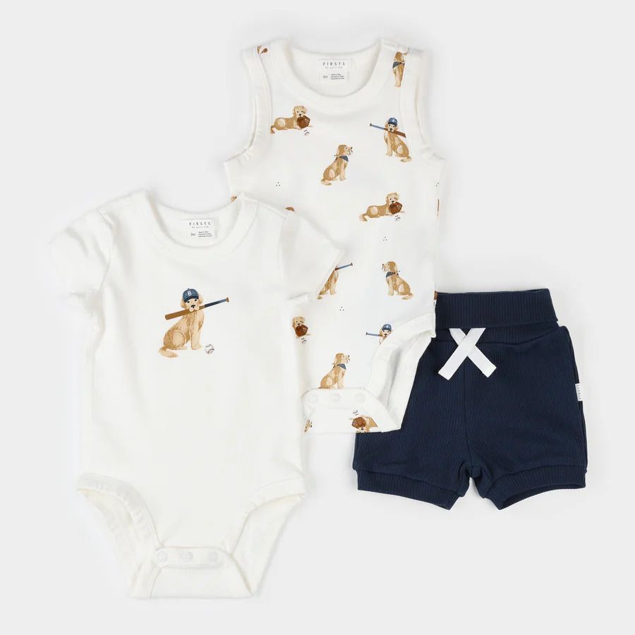 Made for summer’s warmest rays, this 3-piece set features two bodysuits and coordinating high-waisted shorts. It’s always good to have a spare bodysuit in the day bag, making this Baseball print set a great choice for sunny days of adventure.