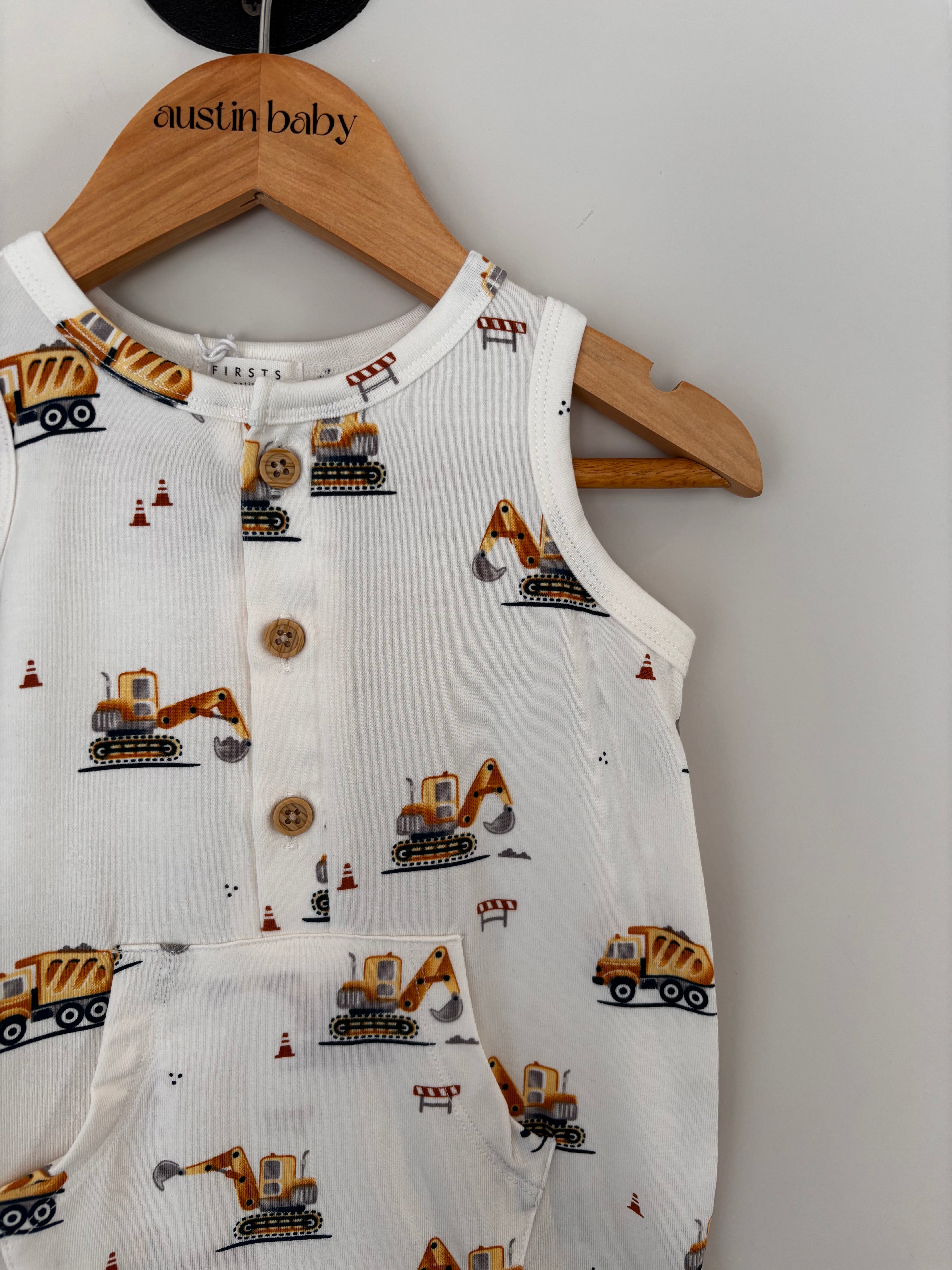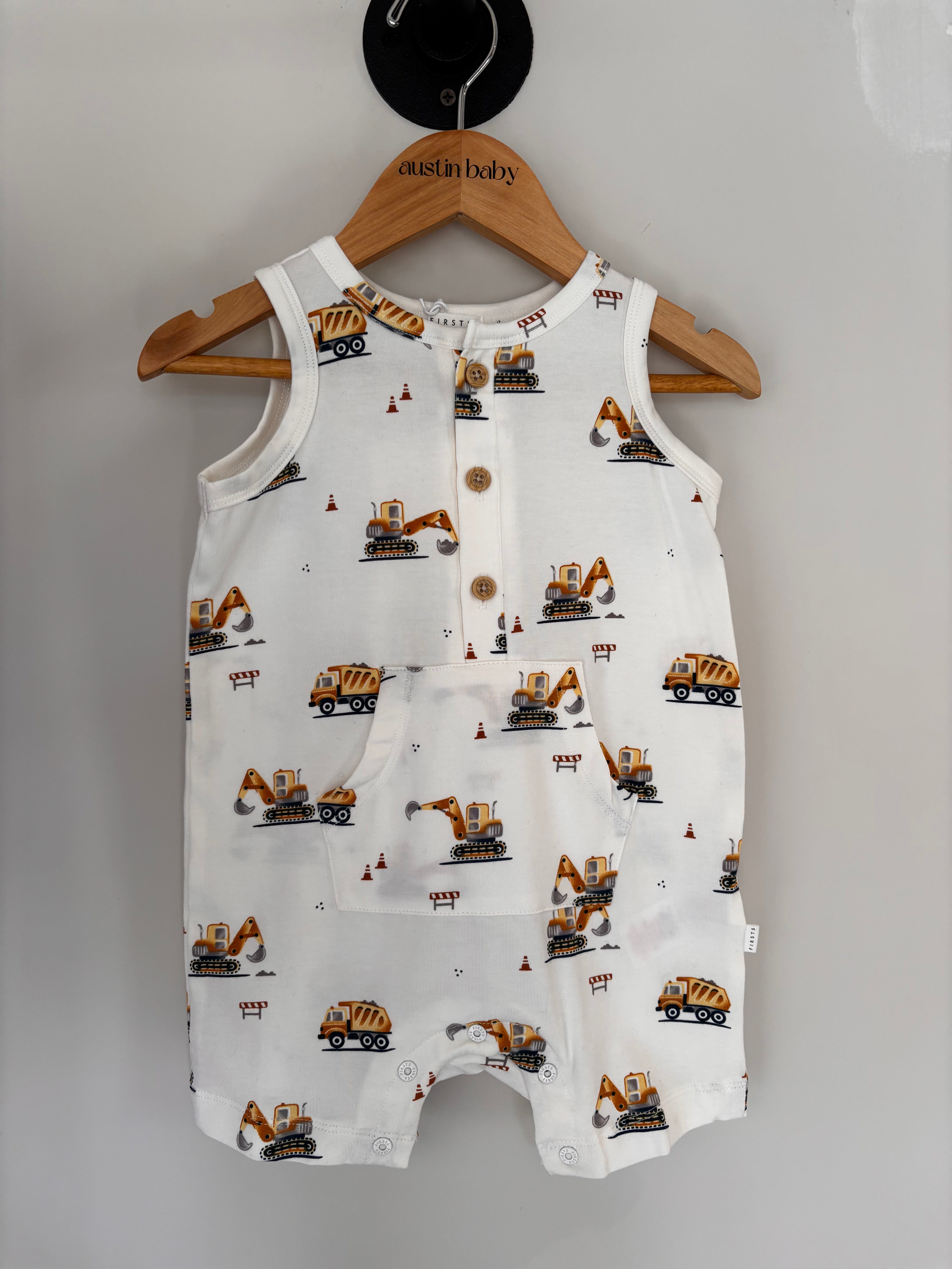 This romper will have all little dudes looking super cute in this perfect construction print. Perfect for spring and summer! Complete with button details and front pocket. Snap closure for easy diaper changes!