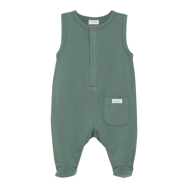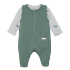 Adorable over-all footed romper and long sleeve body suit two-piece set. Green romper and printed bodysuit allow for endless combinations. Wear together or mix and match with other capsule pieces.