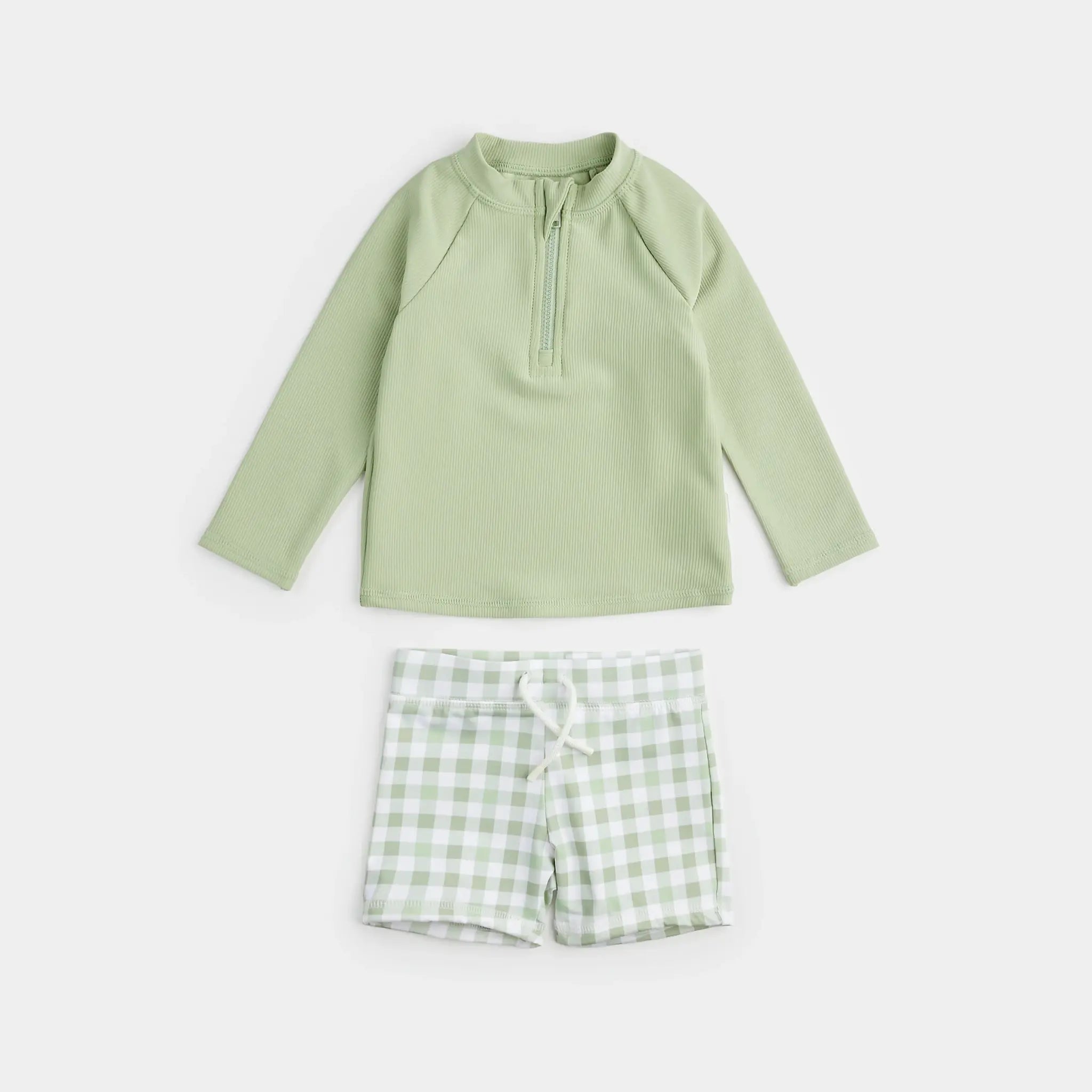 Sage Checkered Rash Guard Top and Swim Short Set