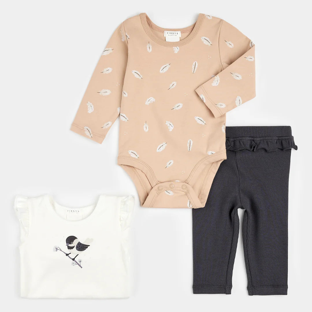 This 3-piece set has everything you need to get your little one ready and out the door. The set offers two bodysuits – one to wear and a spare for the baby bag – and coordinating leggings. The bodysuit shirts feature our all-over feather pattern and a single chickadee design. The set features frilly detailing to add a sweet, girly style to the set. Made from organic cotton jersey and rib, the pieces are super soft and stretchy for comfortable all-day wear.