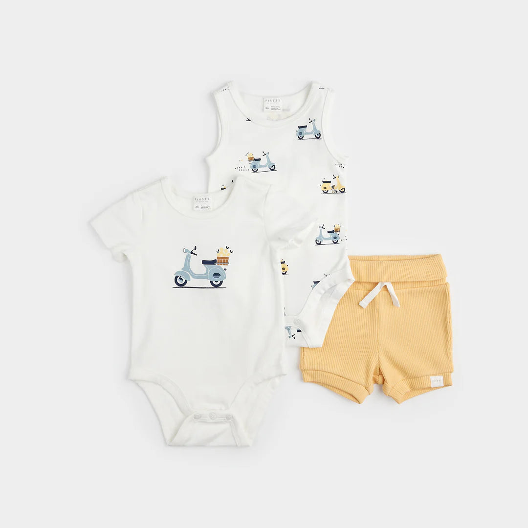 This fun 3-piece set is ideal for gifting to expecting parents or little boys who love to be on the move. The set features a short-sleeved diaper shirt, a vest and coordinating yellow shorts. The tops are made from a stretchy organic cotton jersey, so they’re comfortable while they explore their surroundings. Snap buttons at the bottom make for easy changing and the shorts can be quickly pulled up or down thanks to the gently elasticated waistband.