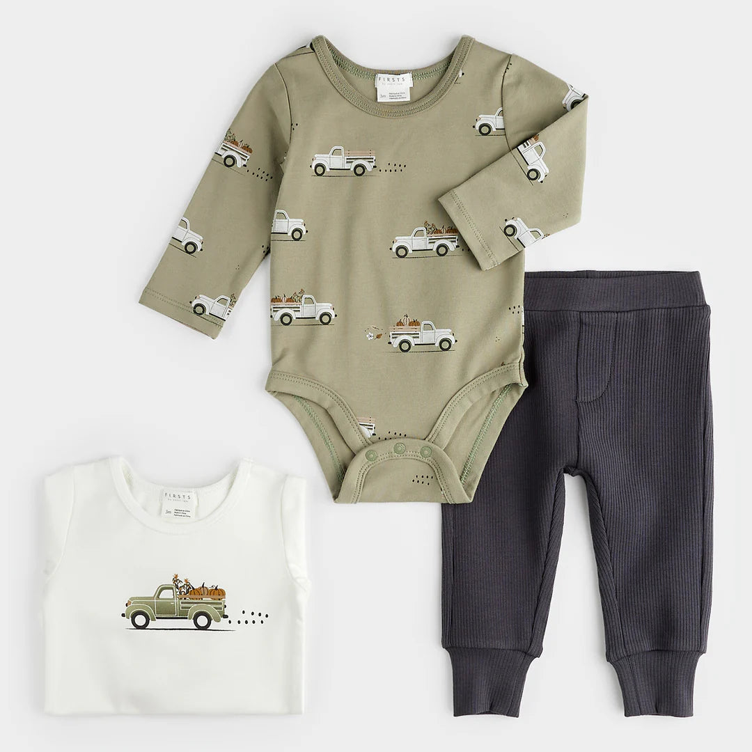 This handy 3-piece set is perfect for gifting to new parents. The set has everything they need to head out for the day, featuring two bodysuits (which you can never have enough of) and some coordinating pants. Featuring our wholesome pumpkin pickup truck pattern, the bodysuits are interchangeable, and the spare can be stashed in the day bag for emergencies. The pants have a thick waistband to protect new belly buttons and upturned ankles for a casual style.