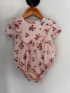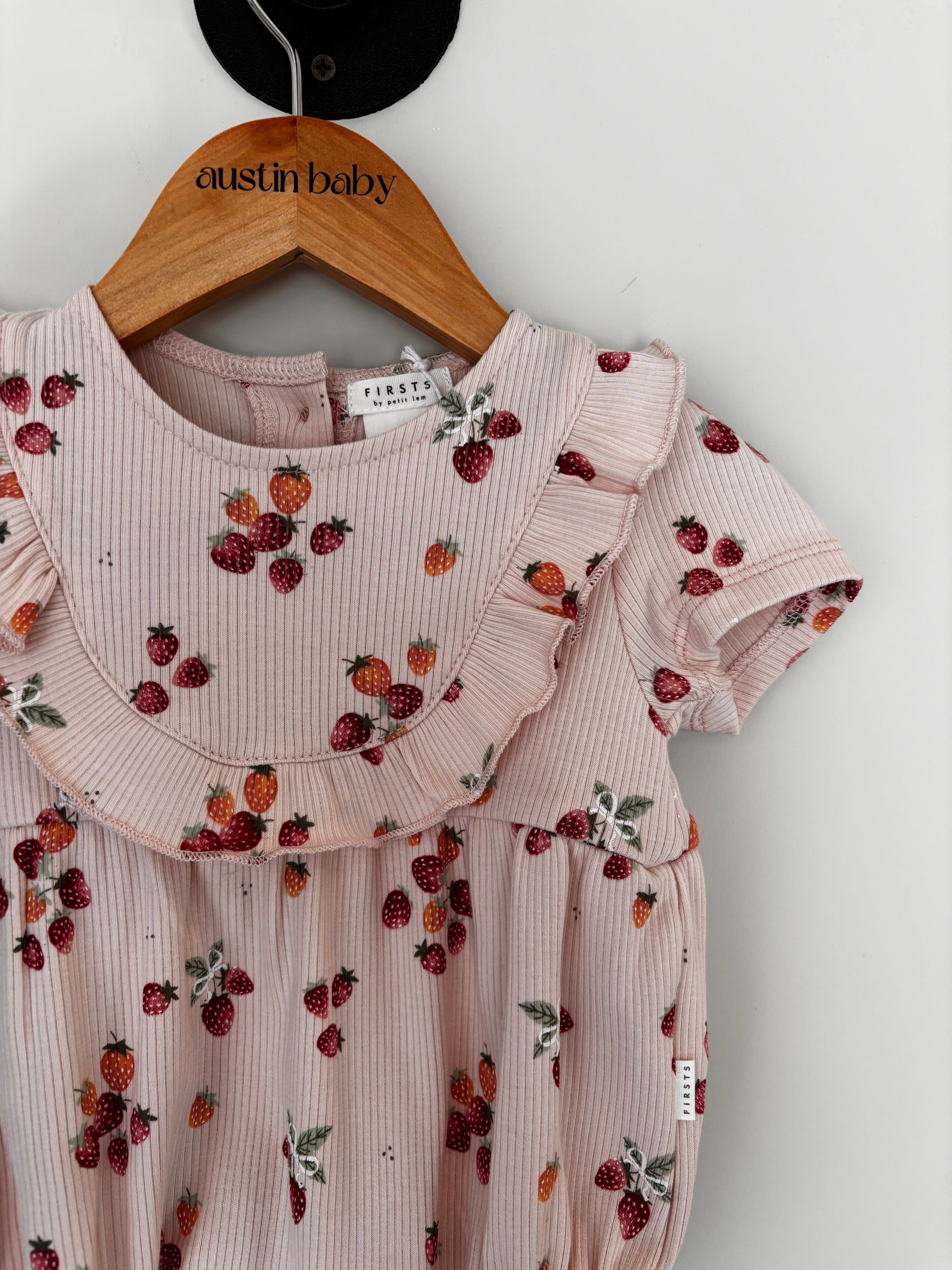 Adorable ribbed bodysuit romper with strawberry print. Snap closure makes diaper changes a breeze. Ruffle detail on the collar for added flare! Available in 3m - 24m