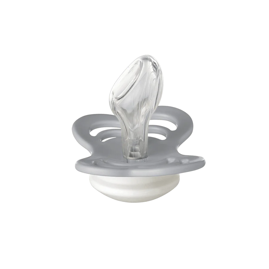 Couture comes with an anatomical nipple that is curved at the top for a natural fit to the baby's palate with an angled tip for easy placement of the tongue. This nipple promotes a tongue placement and sucking technique where the sides of the tongue cup around the nipple, as it does during breastfeeding. The angled tip means that the baby does not need to suck as hard for the pacifier to flatten inside the mouth.