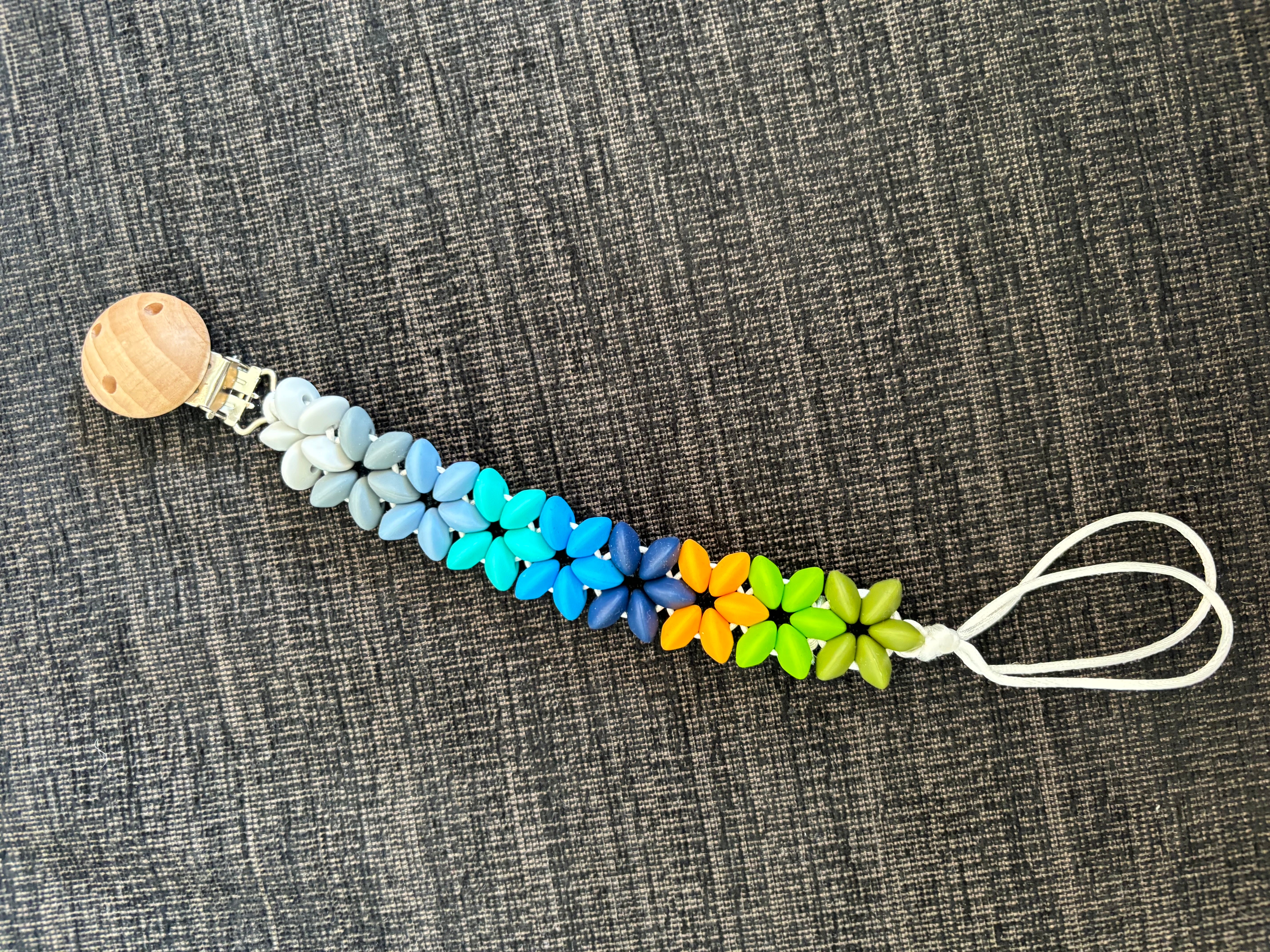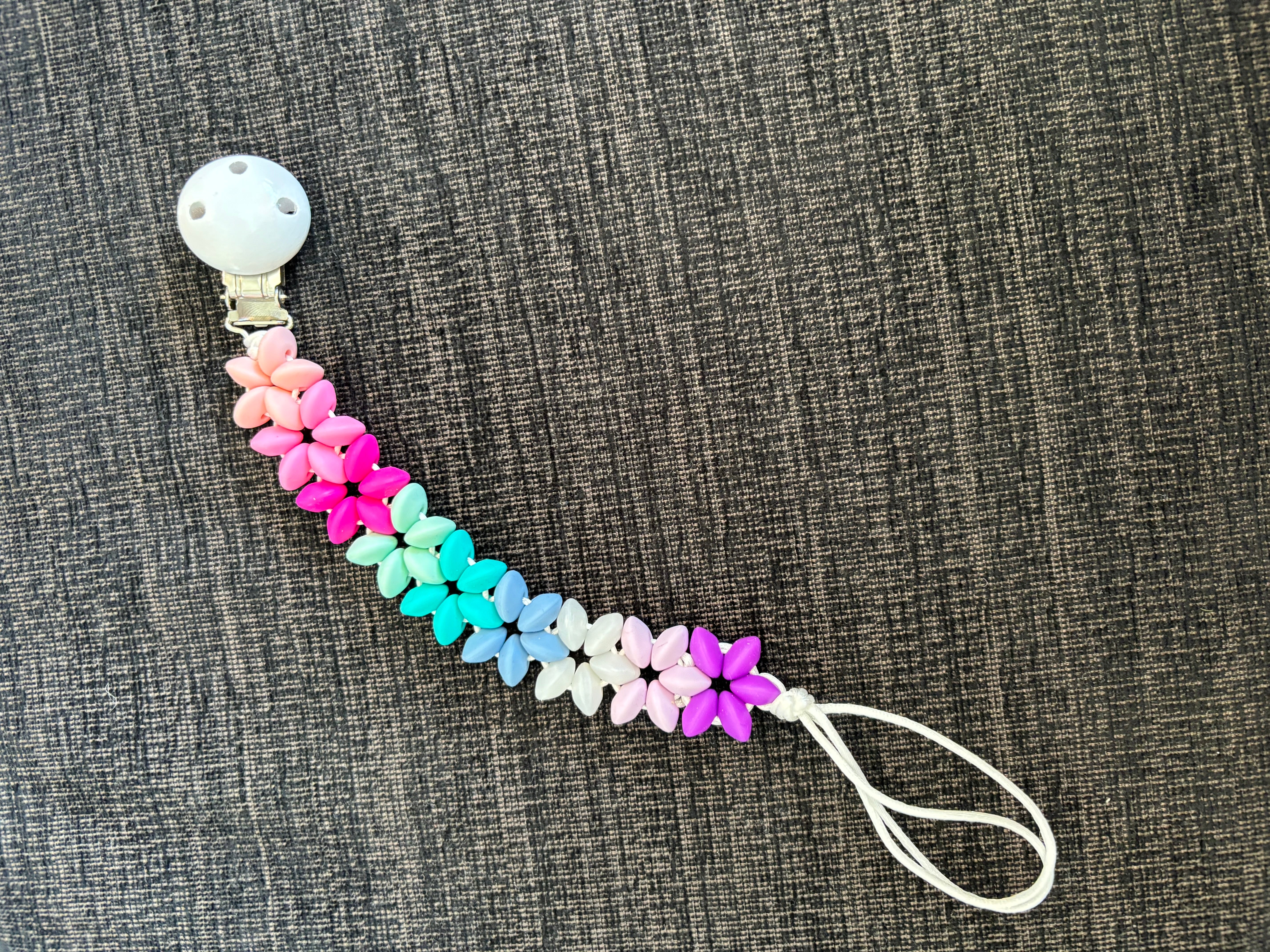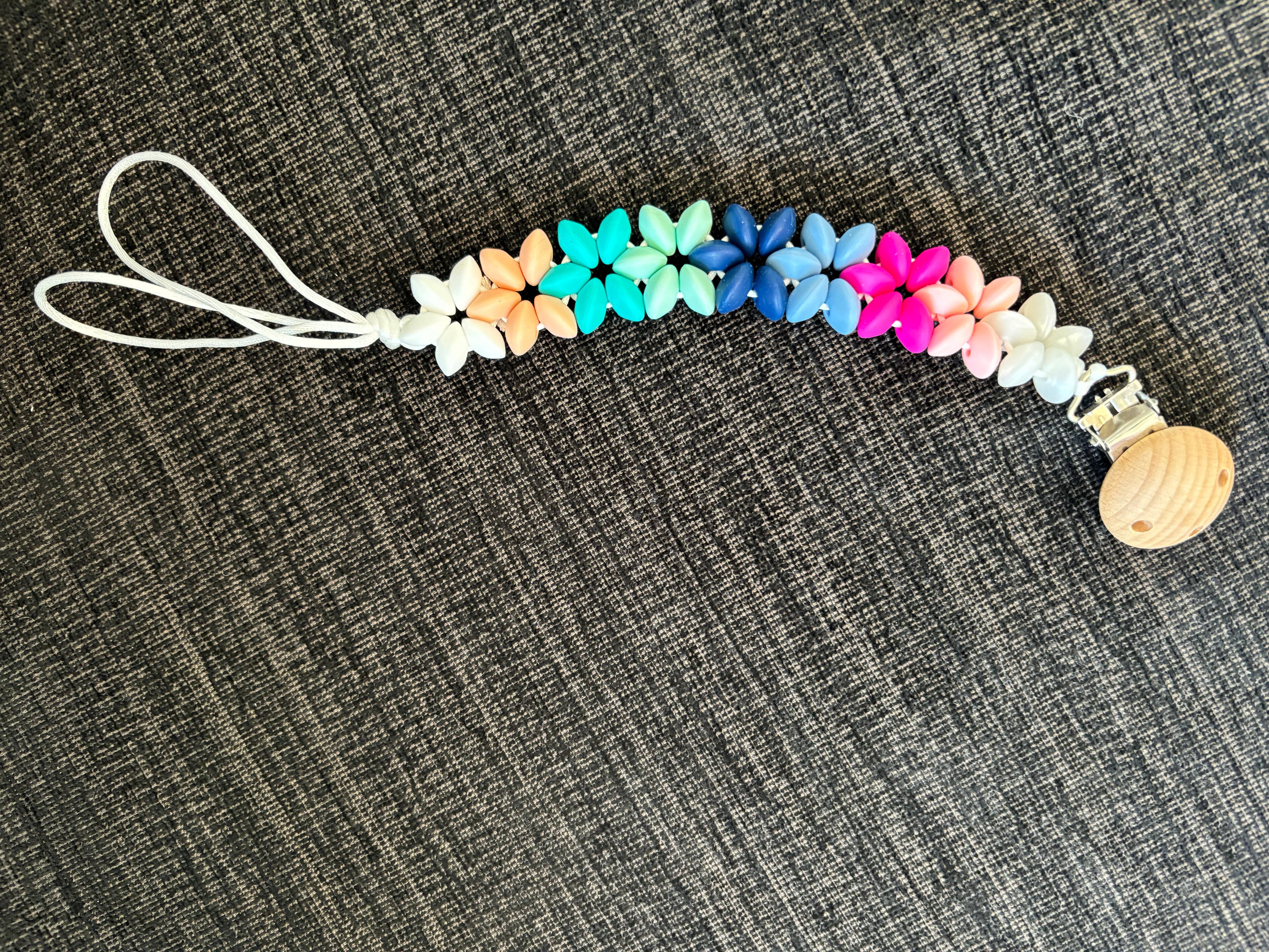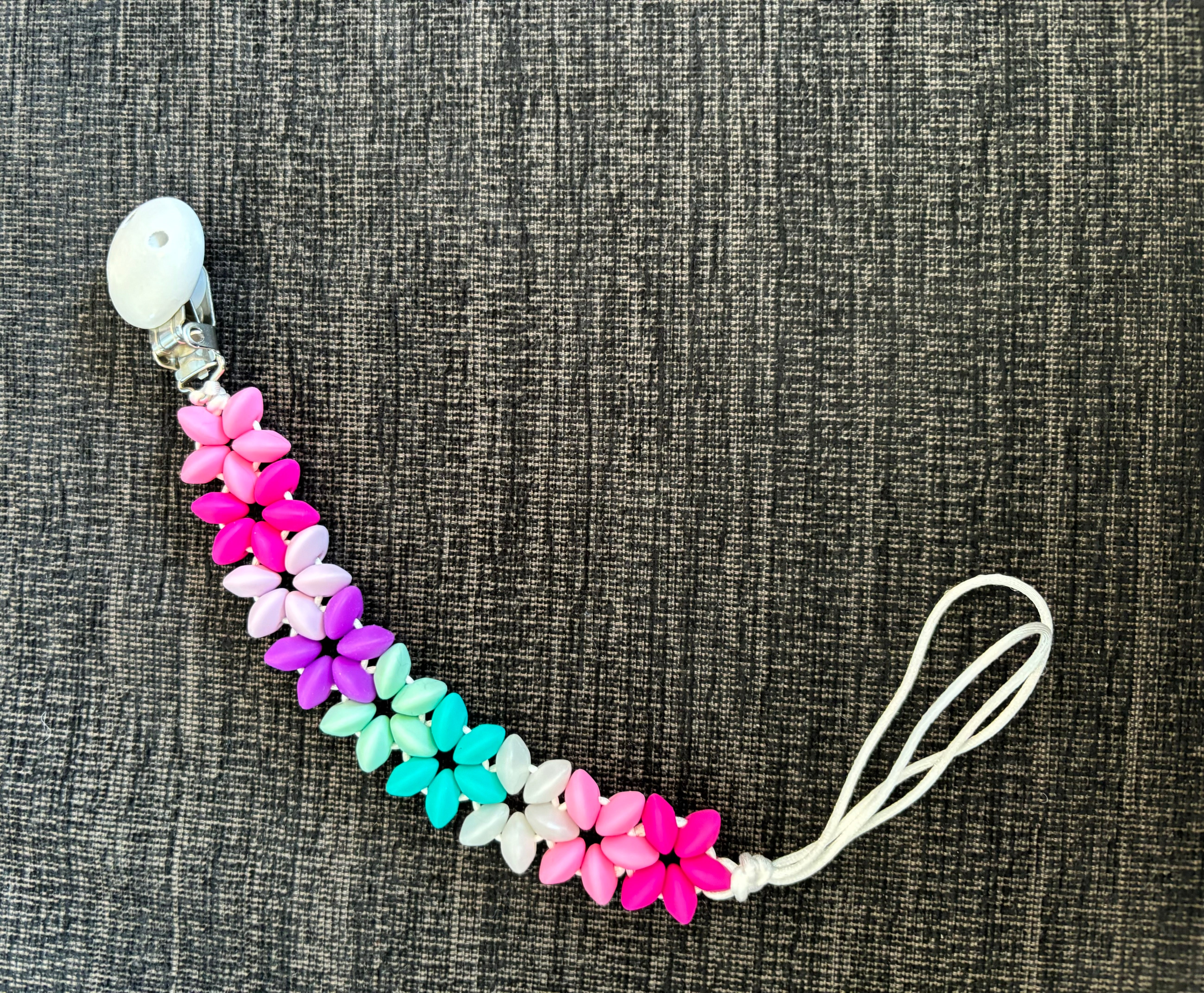 This flower leash, made from medical-grade silicone, features a clip that attaches securely to clothes or a stroller, while the other end holds a pacifier. The soft, flexible silicone soothes teething babies, and the playful flower design adds a fun touch. With this leash, you can keep pacifiers and teethers within easy reach, ensuring they stay clean and close by!