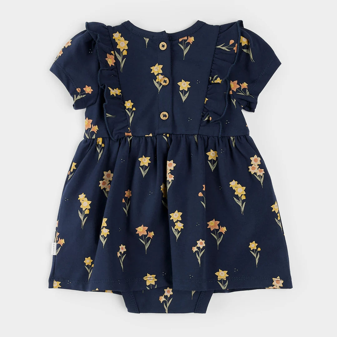 Wave hello to sunnier days with this pretty bodysuit dress featuring buttery yellow daffodils. With an integrated bodysuit, the dress is an easy choice for warm days. With a frilly trim down both sides, she’ll look all dressed up, even if you’re just heading for a picnic. Buttons at the back make over-the-head dressing quick and fuss-free while providing a neat and tidy finish at the front. Made from organically grown cotton jersey, the dress offers the flexibility she needs for crawling, twirling and exploring.