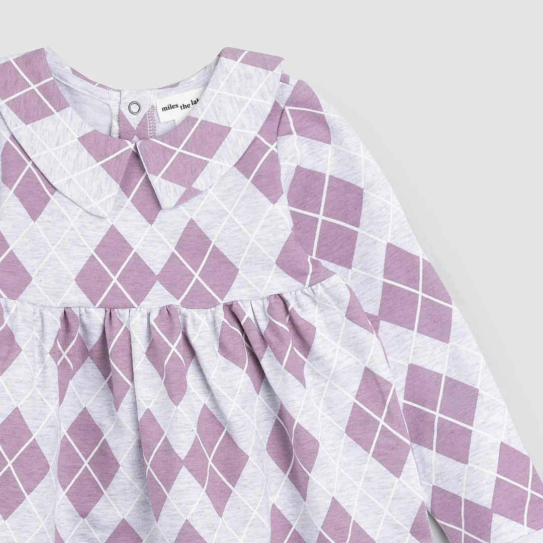 Perfect for winter vacations or sitting by the fire, this fleece dress has a classic argyle print in a lush lilac. With an oversized, peter pan collar and a smock-style skirt, the dress has a sophisticated style that works for casual days cozying up by the fire or for smarter occasions like heading out for food with the family.