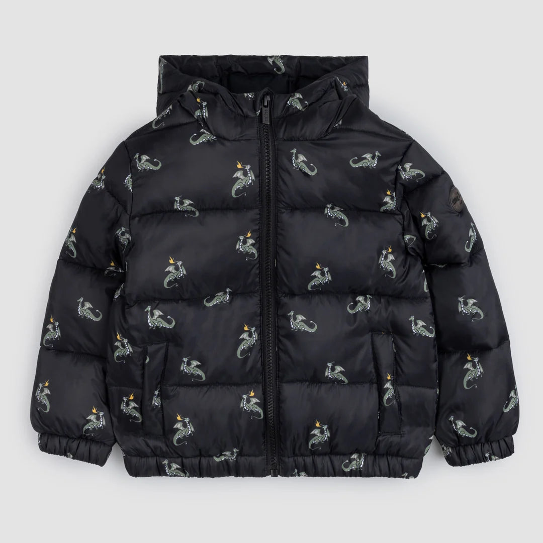 Dragon Print on Black Hooded Packable Puffer Jacket