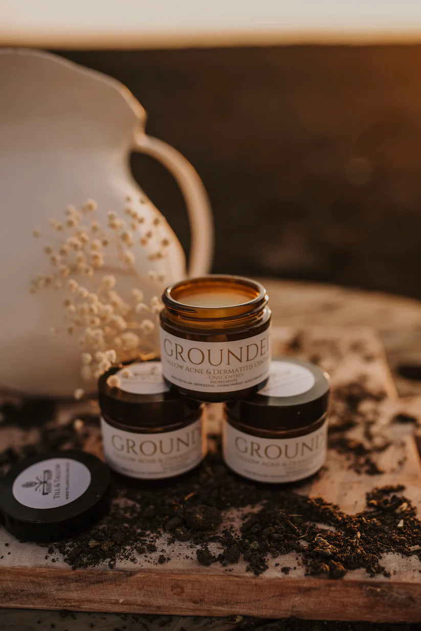 GROUNDED is a deeply soothing, tallow-based ointment designed for skin prone to acne, seborrheic dermatitis, and inflammation. Formulated with a focus on high-linoleic, low-oleic oils, this ointment supports skin barrier health without clogging pores - making it ideal for sensitive, oily, or irritated skin types.